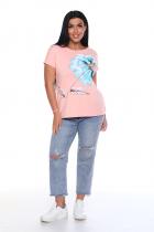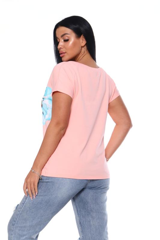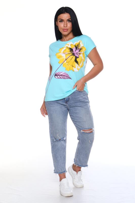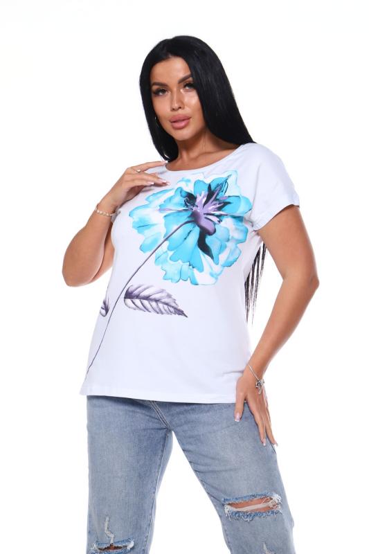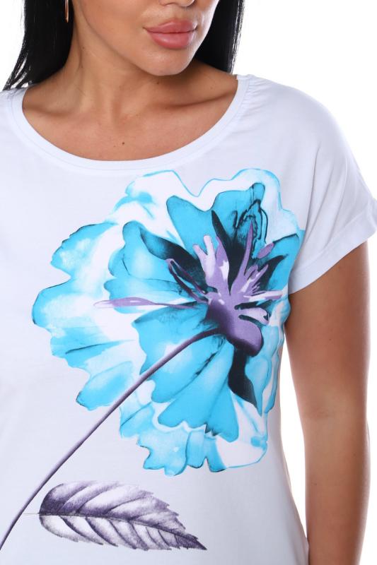 Футболка женская свободного силуэта, с цельнокроеным спущенным рукавом. Спинка оформлена рельефами. Длина изделия до середины бедра. Полочка декорирована принтом в виде цветка. Идеально подходит к брюкам или юбке