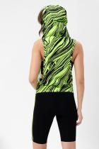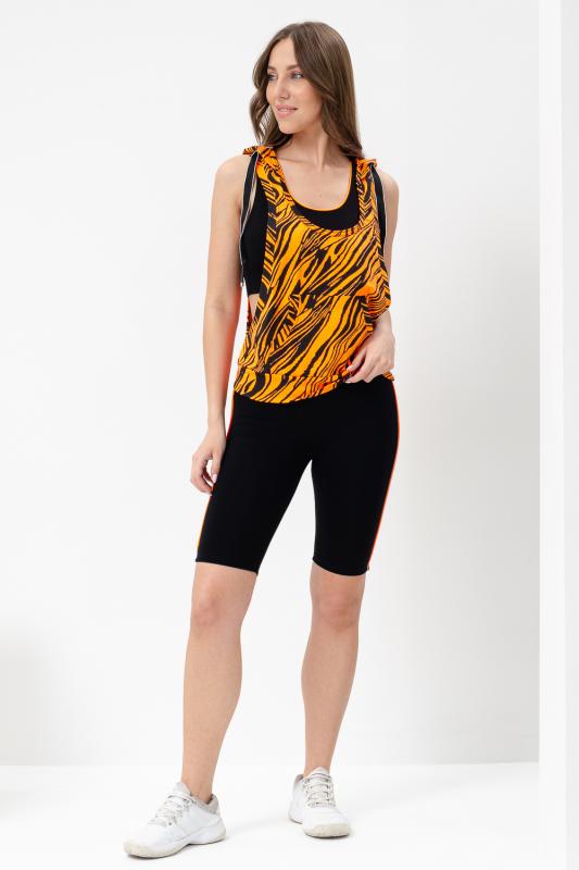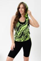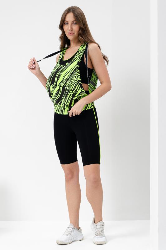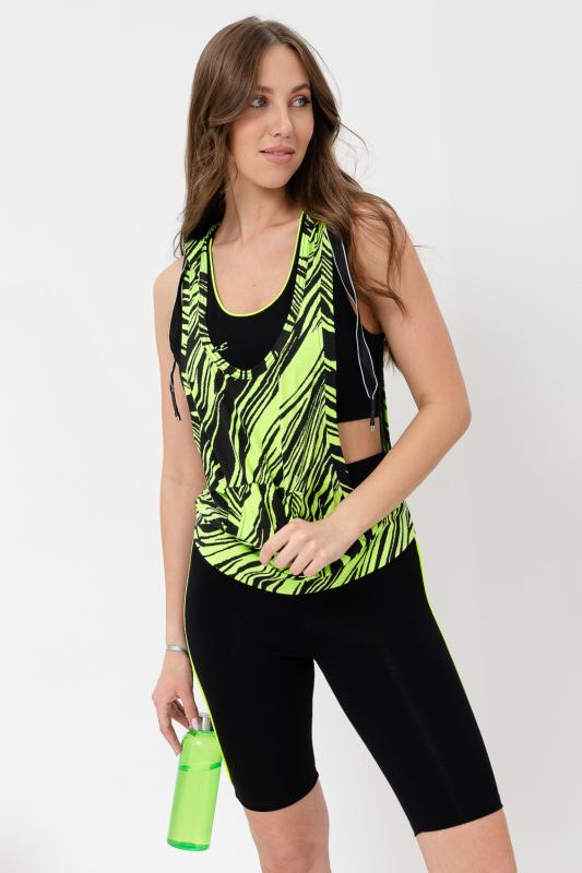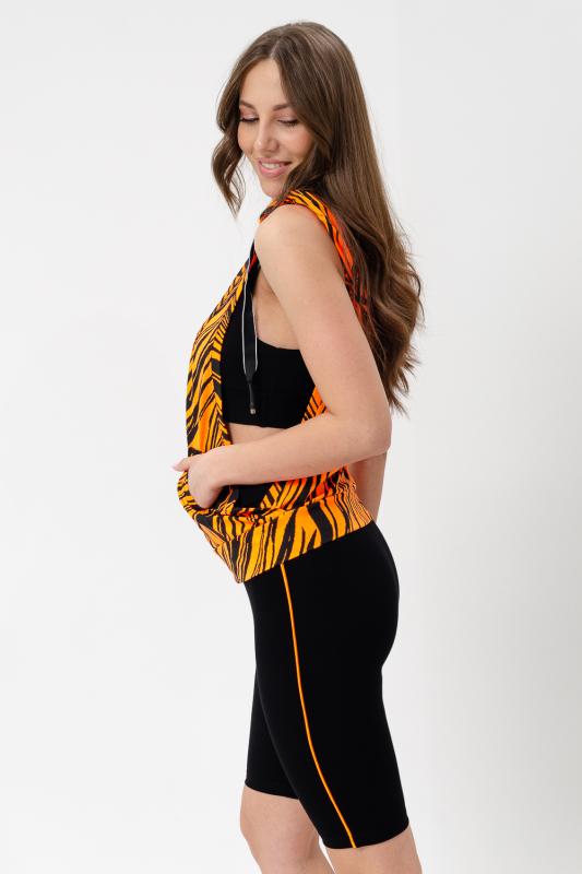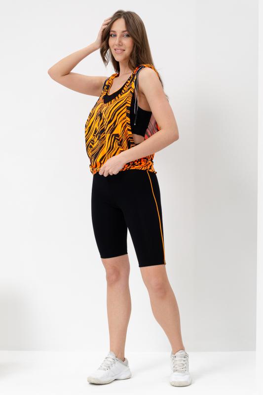 Костюм спортивный женский - тройка, состоит из яркого худи с капюшоном, велосипедок на широком эластичном поясе и укороченного топа со стильным принтом. Подходит для активного отдыха и занятий спортом. Очень удобен для езды на велосипеде.
