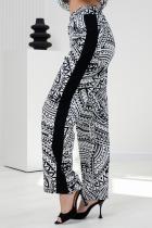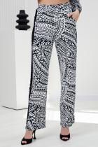 Брюки прямые, на поясе, с боковыми карманами, с лампасами из отделочного полотна вдоль боковых швов.