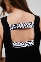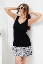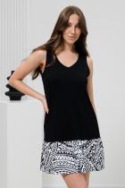 Сарафан полуприлегающего силуэта с расклешением к низу, с V-образной горловиной спереди. На спинке расположен фигурный вырез. Широкая оборка по низу сарафана выполнена из отделочного полотна. Горловина, проймы обработаны бейкой из основного полотна.