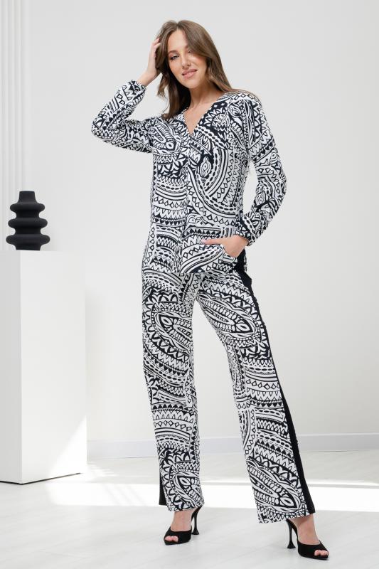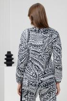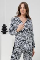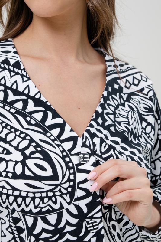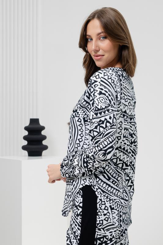 Женская туника-рубашка на пуговицах, без воротника, с V-образной горловиной спереди, с фигурной линией низа. Рукав длинный, низ собран на резинку.
