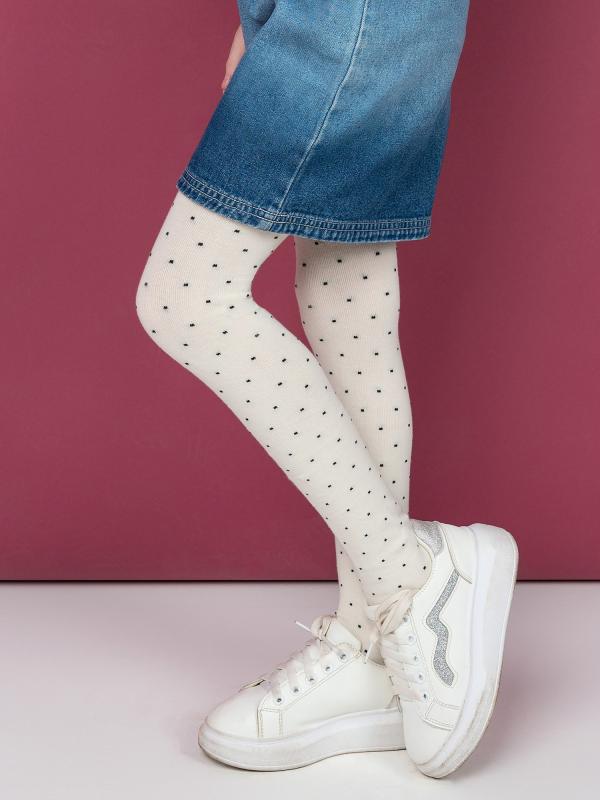 Детские колготки для девочек. Модель, связанная из натурального гребенного хлопка, мягкая, комфортная, воздухопроницаемая. Трендовый рисунок в горошек не оставит равнодушной ни одну маленькую модницу. Колготки можно сочетать как с классической школьной формой, так и с более неформальными образами.