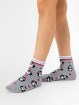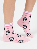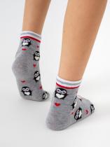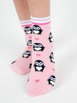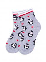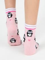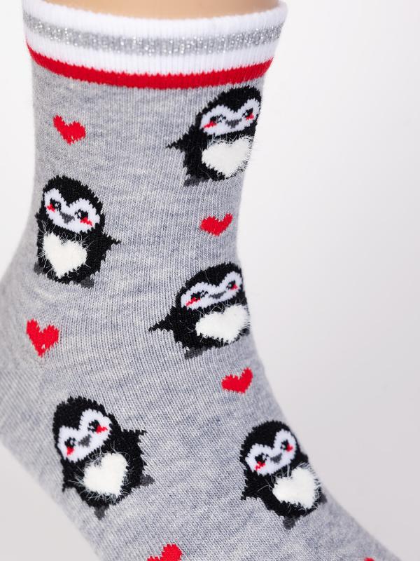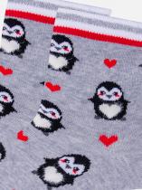 Детские носки с рисунком пингвинчика. Носочки связаны из натурального гребенного хлопка, такие изделия не электризуются, комфортные, тактильно приятные, воздухопроницаемые. Борт модели с люрексом добавит блеска и новогоднего настроения. Очаровательный рисунок пингвинчика покорит как ребенка, так и взрослого. Такие носочки станут отличным дополнением к подарку.