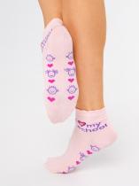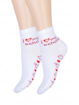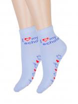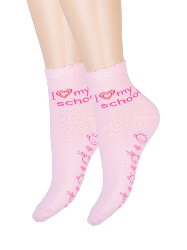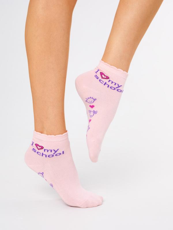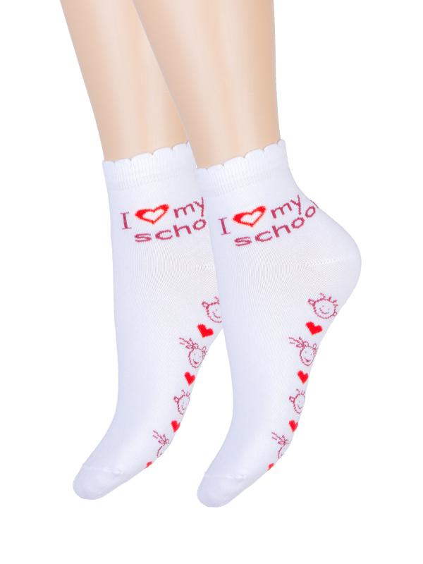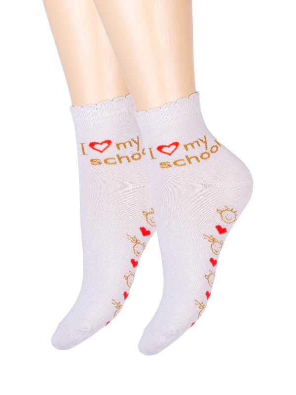 Детские демисезонные носочки с надписью «I love my school» на щиколотке и озорными рожицами на следе. Яркие красные сердечки на спокойном фоне усиливают визуальный эффект. Фигурный борт добавляет модели нежности. Модные молодёжные носочки для современной школьницы.