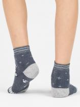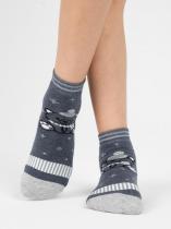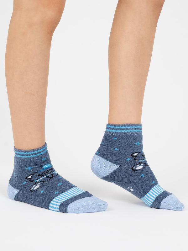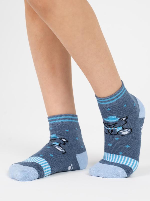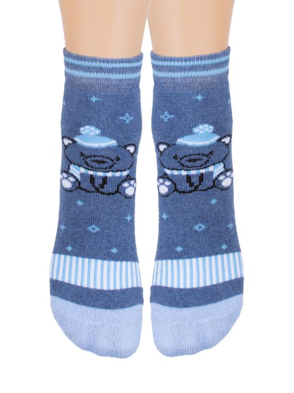 Детские носки с изображением мишки в шапке и шарфе. Носочки представлены в четырех цветовых решения: сером, синем, сине-голубом и серо-голубом. Модель связана из хлопка, который зимой будет отлично согревать ножку, не давая ей при этом преть.
