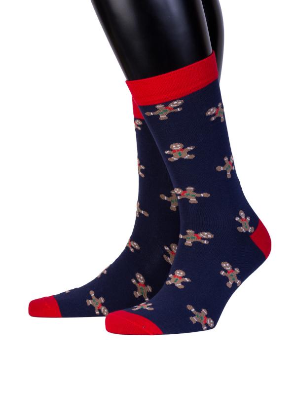 Мужские демисезонные носки с веселыми пряниками. Модель связана из натурального гребенного хлопка, комфортная и тактильно приятная. Борт и мысок изделия в акцентном красном цвете в сочетании с рисунком придают модели праздничное настроение. Такие носки станут отличным дополнением к подарку!