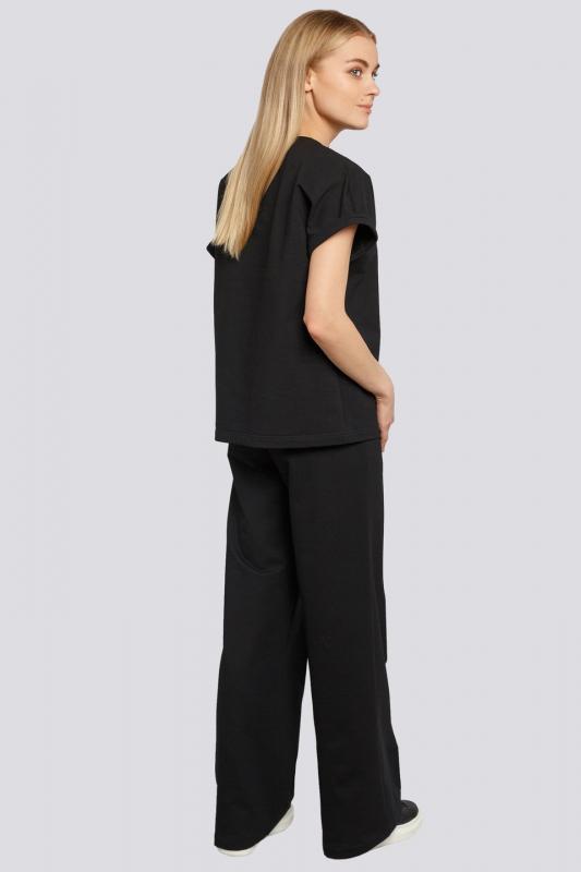 В моду ворвался свободный непринужденный стиль. Стилисты предлагают использовать в своих повседневных луках удобные, практичные предметы одежды, не вызывающие дискомфорта. Женственный костюм из трикотажа, состоящий из свободного свитшота и широких брюк. Брюки широкие со стрелками и кармашками на боках. Свитшот свободного кроя, плечо спущенное, по низу рукава манжет. Состав трикотажа: 75% хлопок, 20% полиэстер, 5% спандекс.