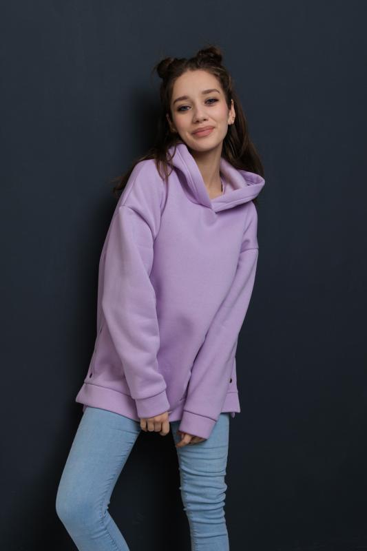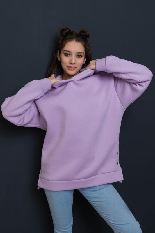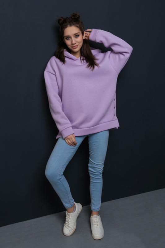 Толстовка женская, отличный вариант для прогулок и активного отдыха. Изделие выполнено из эластичного, теплого, трикотажного полотна футер 3-х нитка с начесом. По бокам расположены разрезы на кнопках. Они не только дополняют образ, но и несут функциональный характер. Низ изделия, как и манжеты выполнены из основного материала.