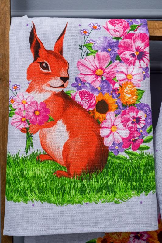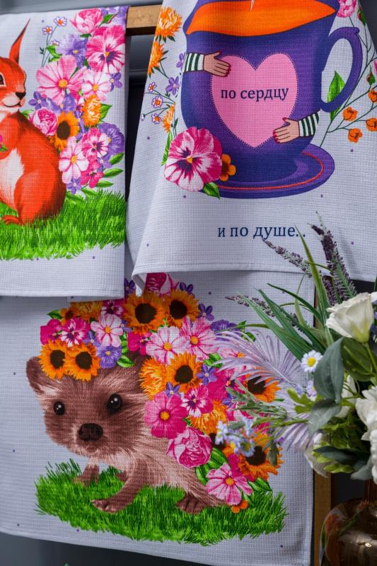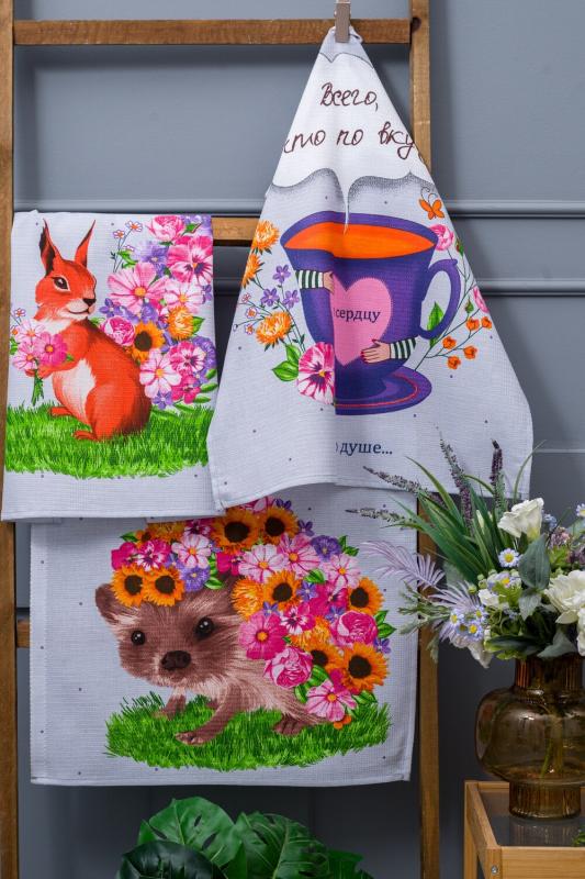 - идеальное дополнение к вашей кухне. В наборе представлены 3 полотенца серого цвета с яркими цветами. Два полотенца украшены милыми изображениями белки и ежика, которые придадут вашей кухне уют и тепло. Размер каждого полотенца составляет 60*48 см, что делает их удобными в использовании. Кроме того, каждое полотенце оснащено петелькой для удобного хранения и подвешивания. Эти полотенца отлично впитывают влагу и быстро сохнут, что делает их идеальным выбором