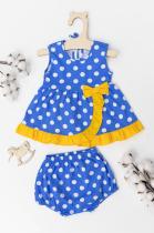 Комплект выполнен из хлопкового полотна. Платье с рюшами и бантом, сзади горловина с завязками. Шортики с резинкой по "