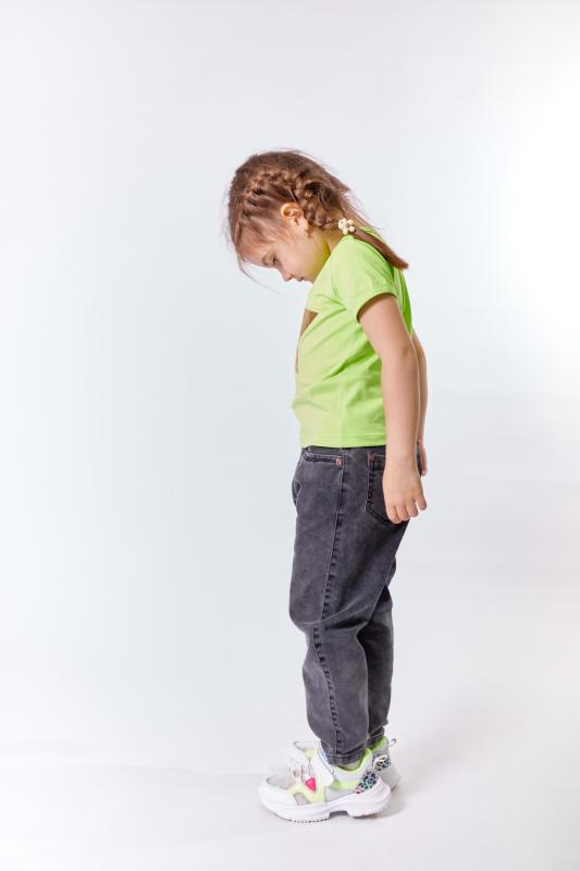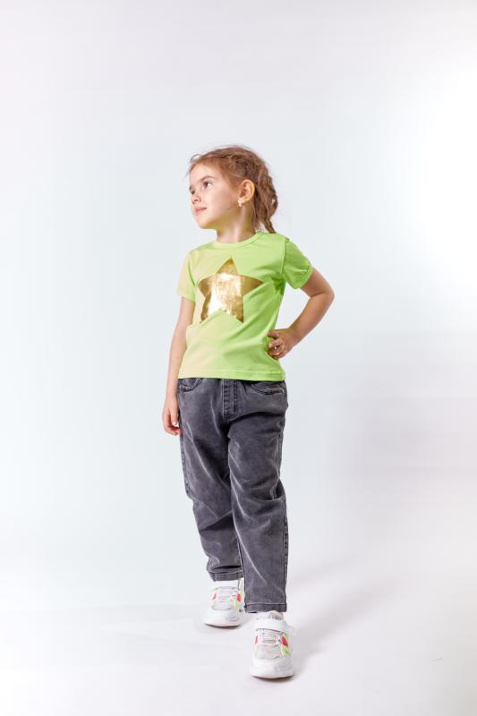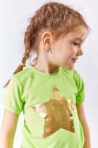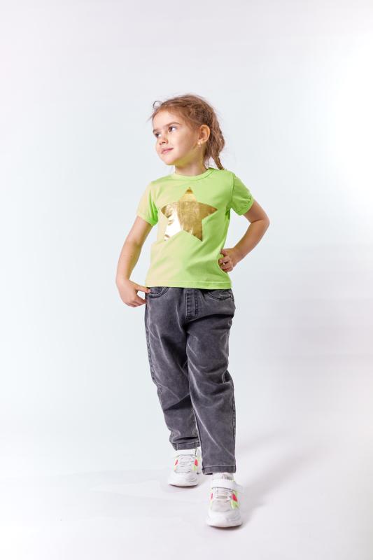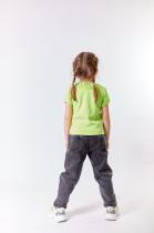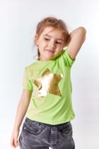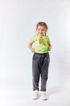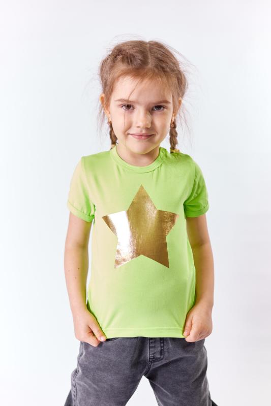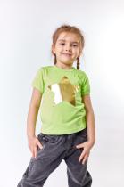 Футболка из однотонной кулирки с лайкрой. Короткий рукав, круглый вырез горловины с застёжкой на кнопки. Спереди расположен принт.