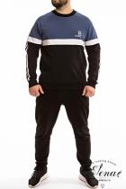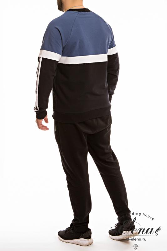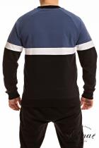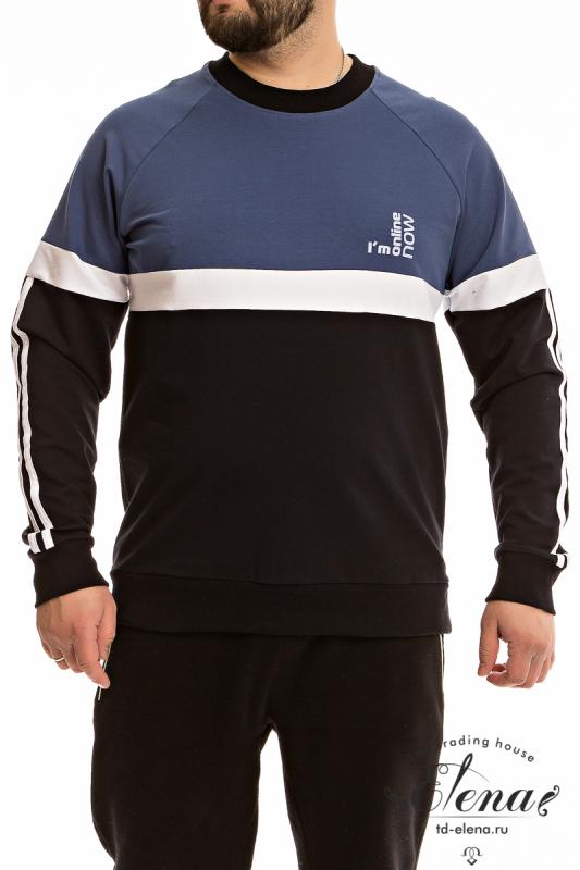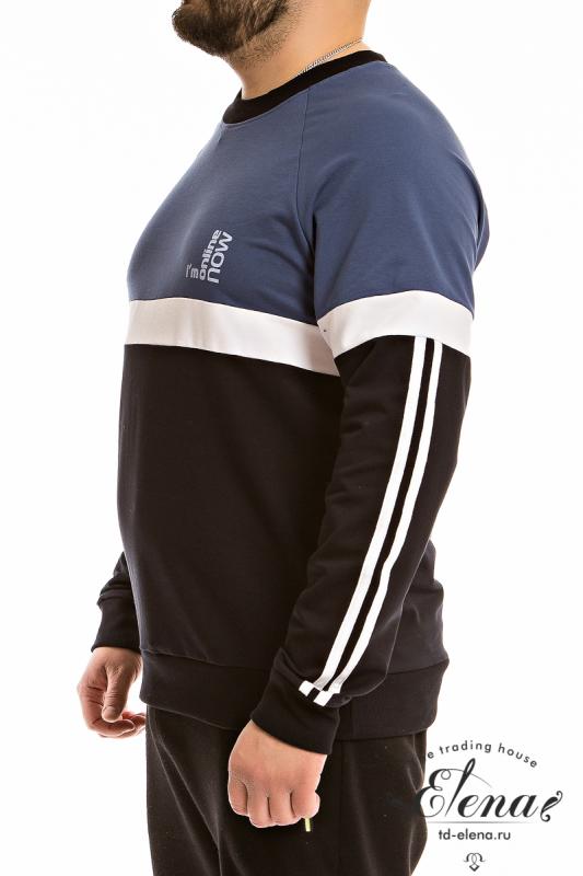 Мужская толстовка из футера петли с длинным рукавом реглан представляет собой стильное и оригинальное изделие. Верх толстовки выполнен в цвете индиго, нижняя часть - темно-синяя, а между ними вставка из полотна белого цвета создает яркий контраст и добавляет интересный акцент к дизайну. Круглый вырез горловины, манжеты на рукавах и манжет по низу выполнены из кашкорсе темно-синего цвета, это все придает изделию завершённый вид. Спереди в верхней части нанесен принт, а на рукавах настрочены лампасы белого цвета, что делает дизайн еще более интересным. Сочетание необычного дизайна и качественных материалов делает изделие превосходным вариантом для создания оригинального образа.