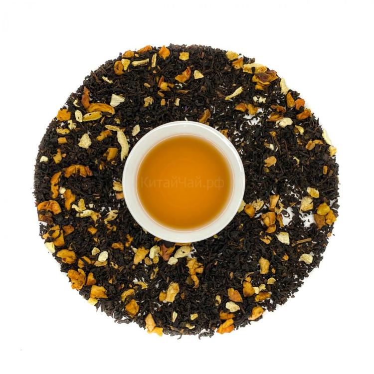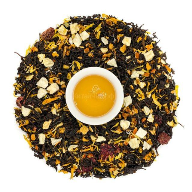 Крупнолистовой черный чай, кусочки персика, цедра апельсина, яблоко, ягоды малины, календула.