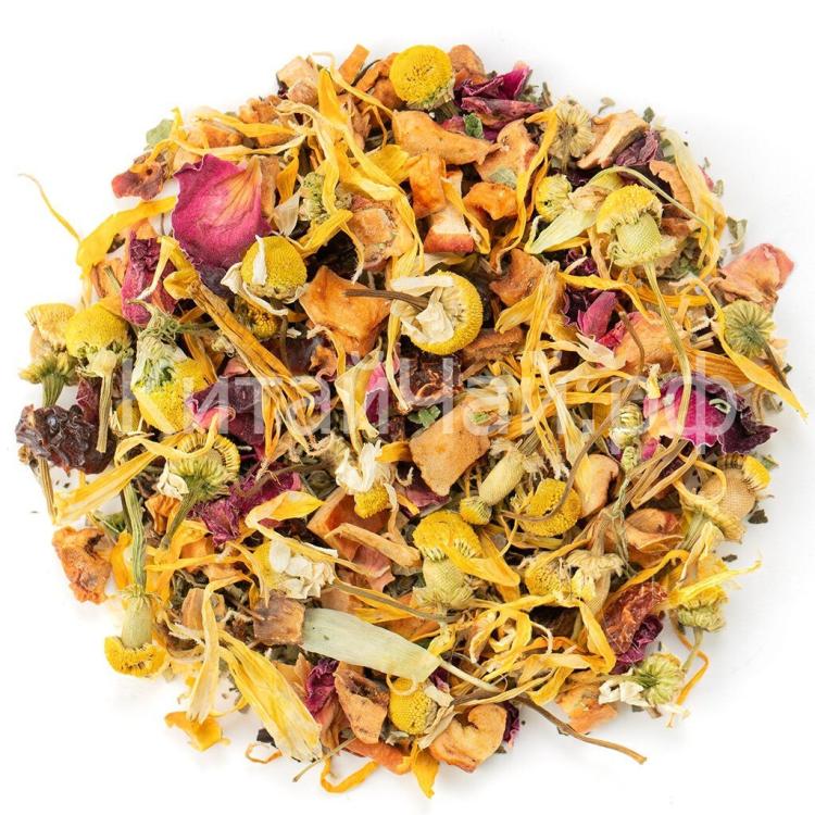 Яблоко, шиповник, лист ежевики, чабрец, мелисса, цветы ромашки, лепестки красной розы, лепестки календулы.