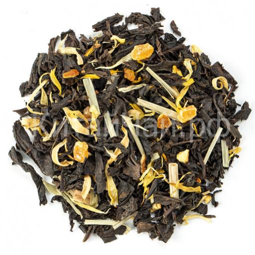 Черный чай, цукаты ананаса, цедра апельсина, лимонная трава, лепестки календулы, цветки апельсина, аромат сладкого апельсина.