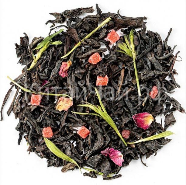 Черный индийский чай Ассам, рубленый клубничный лист и кусочки клубники, лепестки василька, аромат игристого шампанского.