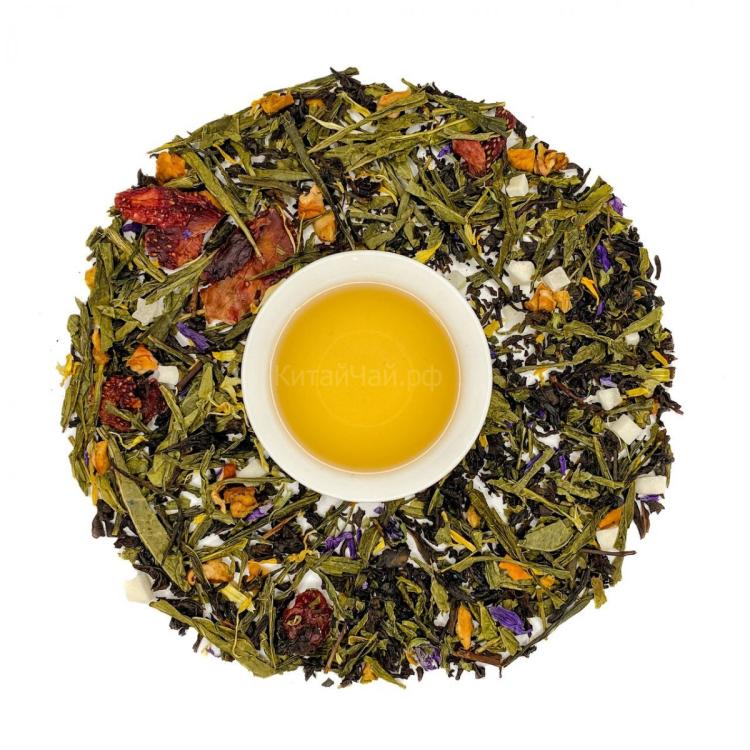 Зеленый чай, лепестки календулы, ягоды боярышника, цукаты ананаса, аромат спелого манго.
