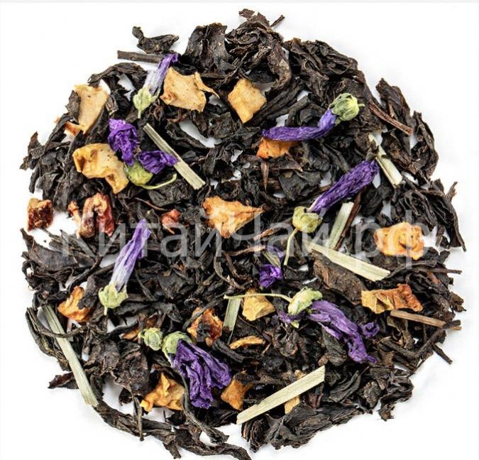 Черный чай, кусочки яблока, лимонная трава, цветы мальвы, аромат цветущего сада.