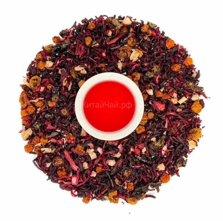 Среднелистовой каркаде, плоды рябины, изюм, кусочки ананаса и шиповника.