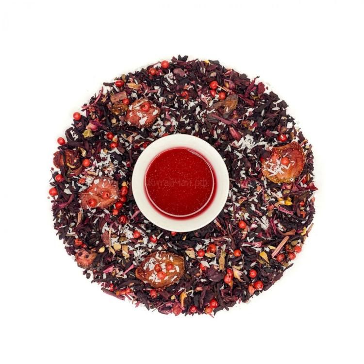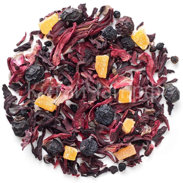 Фруктовый чай на основе крупных лепестков суданской розы (гибискуса), ягод красной и черной вишни, цедры шиповника, цукатов ананаса, аромат спелой вишни и ванили.