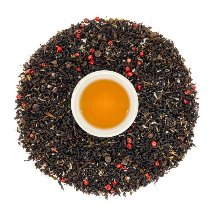 Черный чай, дарджиллинг, розовый перец, кокосовая стружка, капли шоколада.