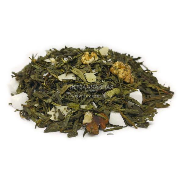 Зеленый китайский чай Сенча с добавлением ядер грецкого ореха, арахисовых лепестков, кусочков ананаса, кокосовых кубиков и стружки. Чай ароматизирован маслом грецкого ореха и сливками.