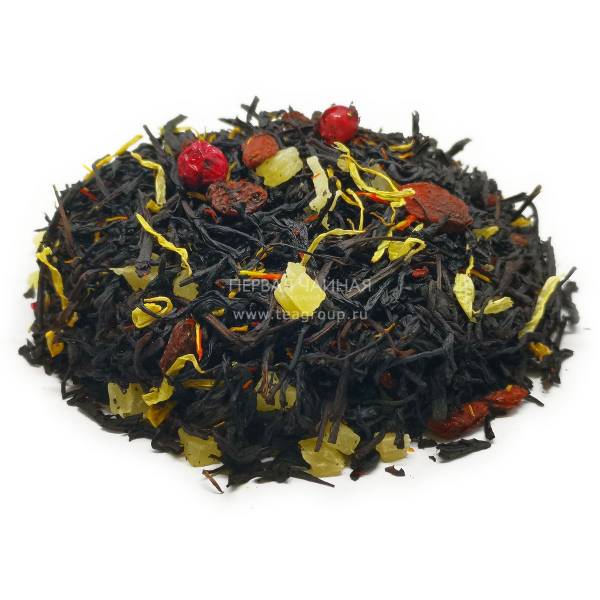 Отборный крупнолистовой цейлонский черный чай с лепестками сафлора, кусочками ананаса и цедрой апельсина, дополненный ароматом айвы и черимойи.